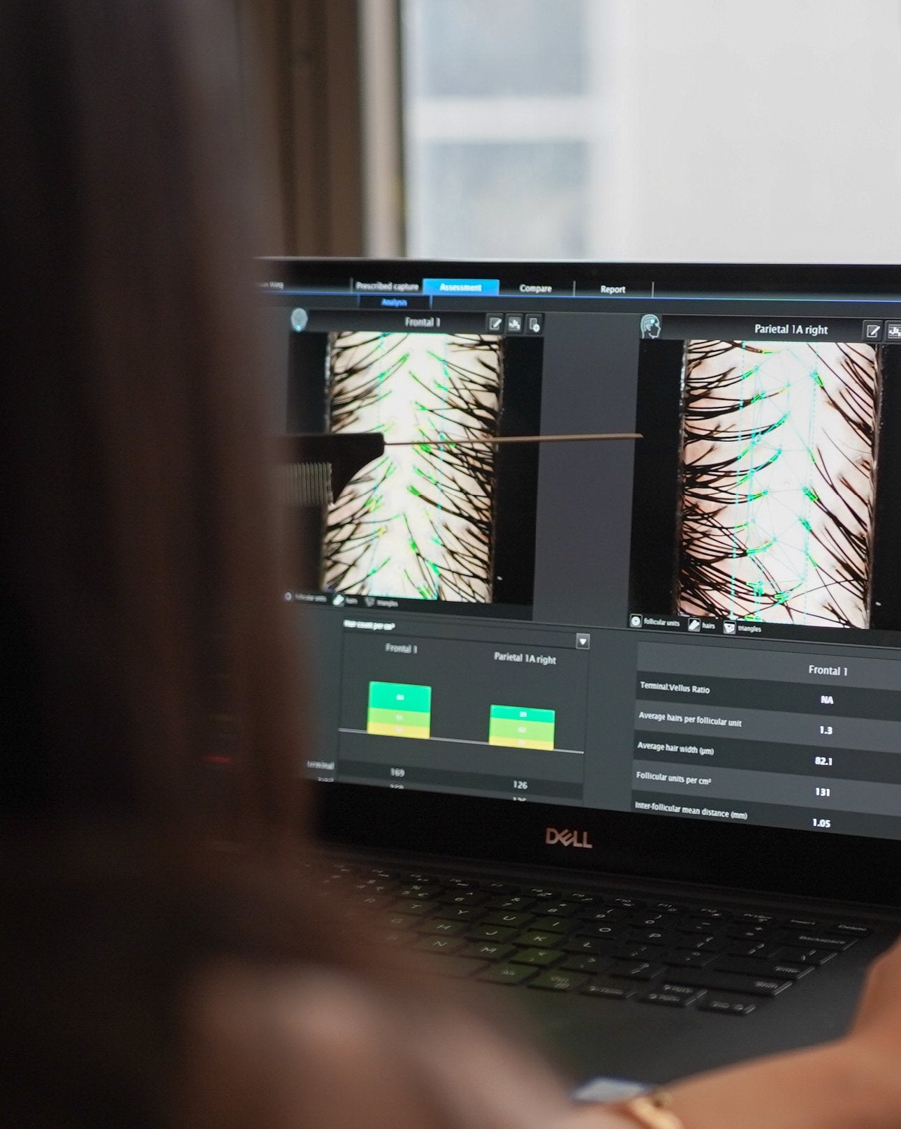 Vida Glow is one of the only non-dermatological business in Australia to own a HairMetrix device, which speaks to our on-going commitment to science; ensuring our products are performing as they should and having the objective data to back it up. Using trichoscopy (dermoscopic imaging of the scalp and hair), the HairMetrix provides a comprehensive insight into all aspects of hair health. The device measures things like hair growth, the number of new hairs, the number of new hair follicles, the terminal to vellus ratio (implicated in androgenic alopecia), hair length, hair thickness and hair density.