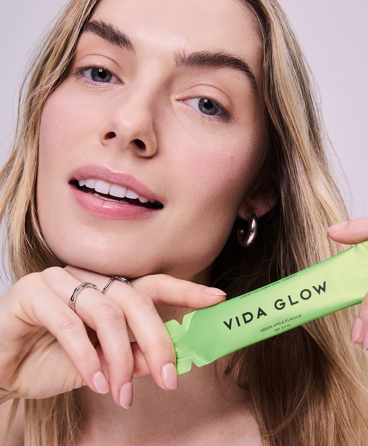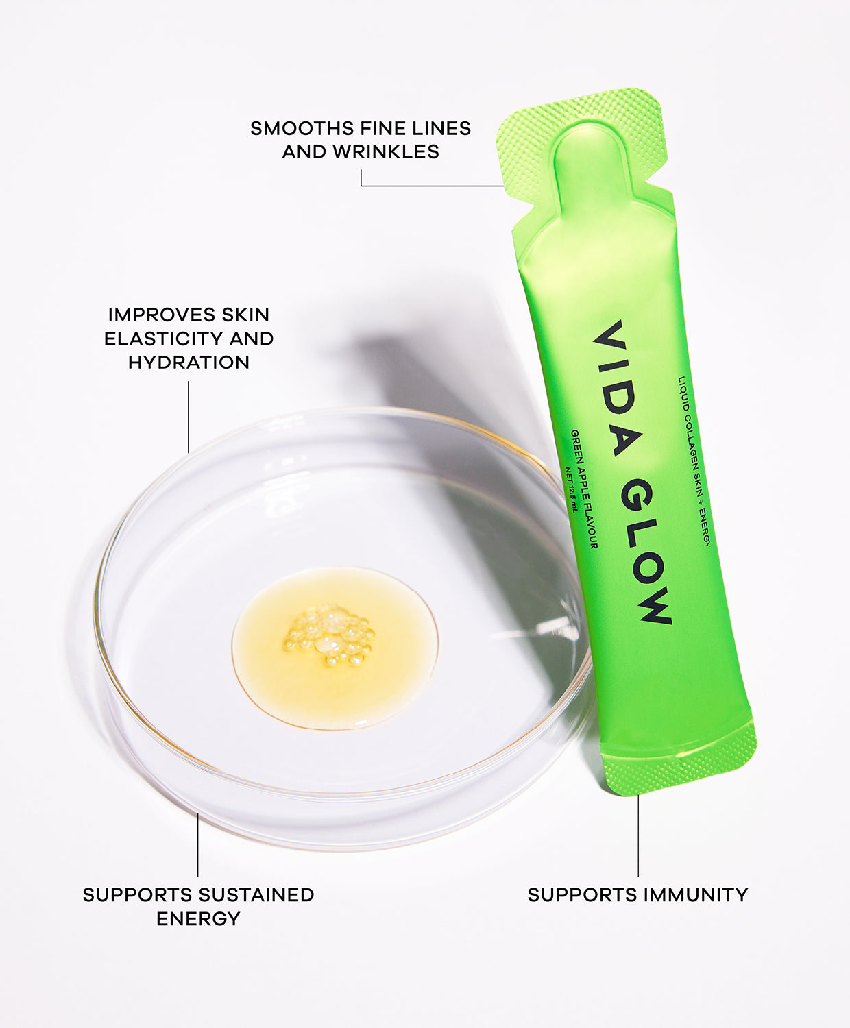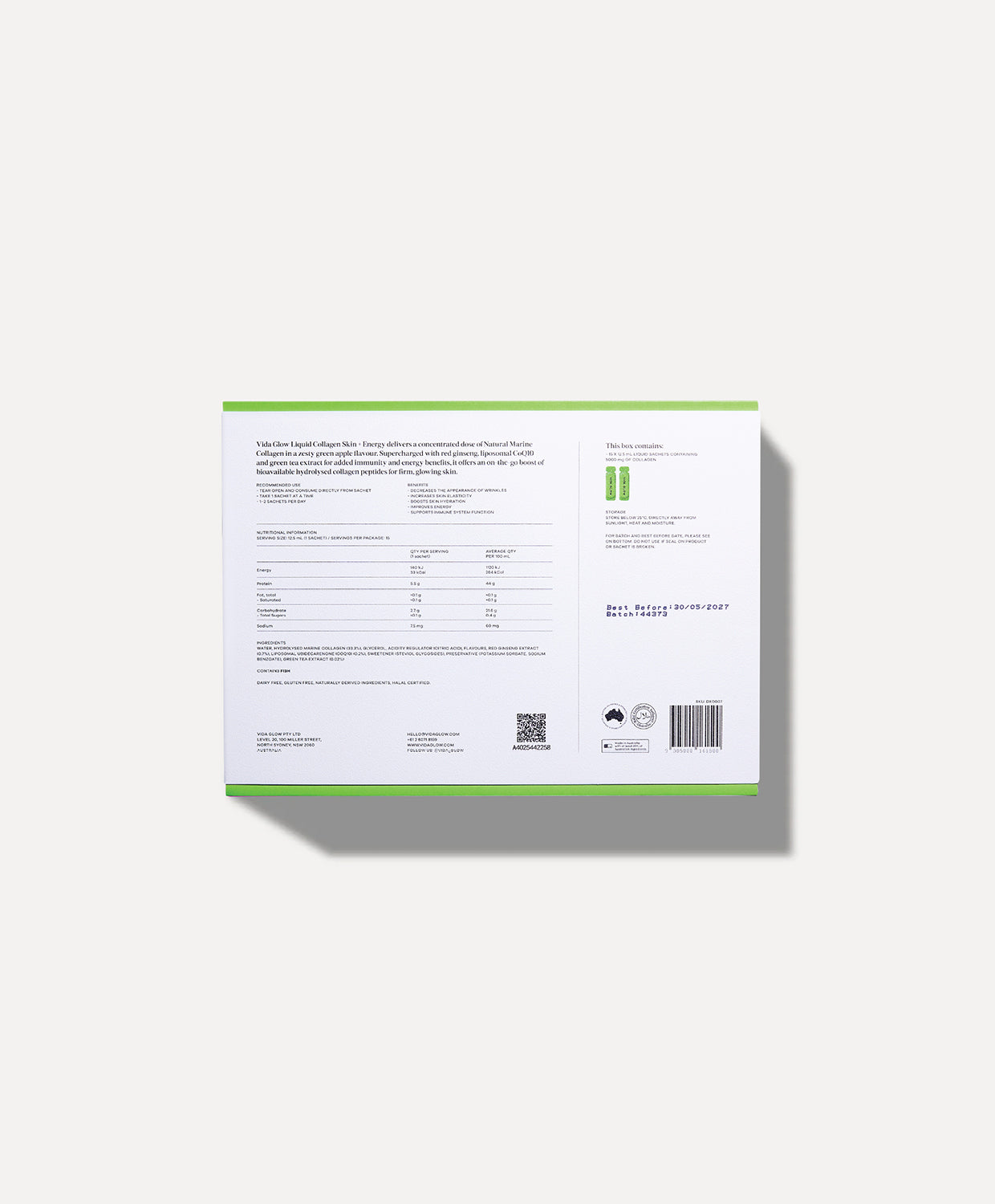 Liquid Collagen Skin + Energy is an on-the-go collagen drink in a ready-to-consume green apple liquid. With 5g of Vida Glow’s best-selling Natural Marine Collagen, it delivers a double dose of collagen in just one daily sachet. The formula is enhanced with liposomal CoQ10, red ginseng, and green tea extract for added immunity and energy benefits. If you’re busy, time-poor and really looking for an anti-ageing supplement with the added benefits of energy production, Liquid Collagen Skin + Energy is for you.