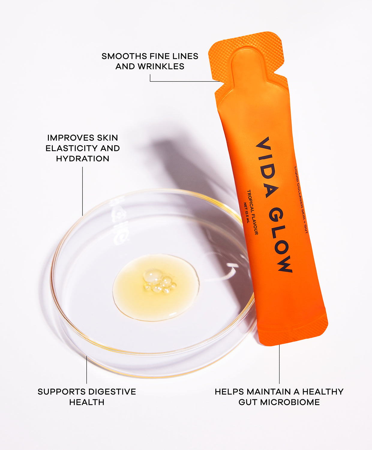 Liquid Collagen Skin + Gut is an on-the-go collagen drink in a ready-to-consume tropical liquid. With 5g of Vida Glow’s best-selling Natural Marine Collagen, it delivers a double dose of collagen in just one daily sachet. The formula is enhanced with aloe vera and prebiotics to help support gut microbiome balance and maintain digestive health. If you’re busy, time-poor and really looking for ananti-ageing supplementwith the added benefits of gut health support, Liquid Collagen Skin + Gut is for you.