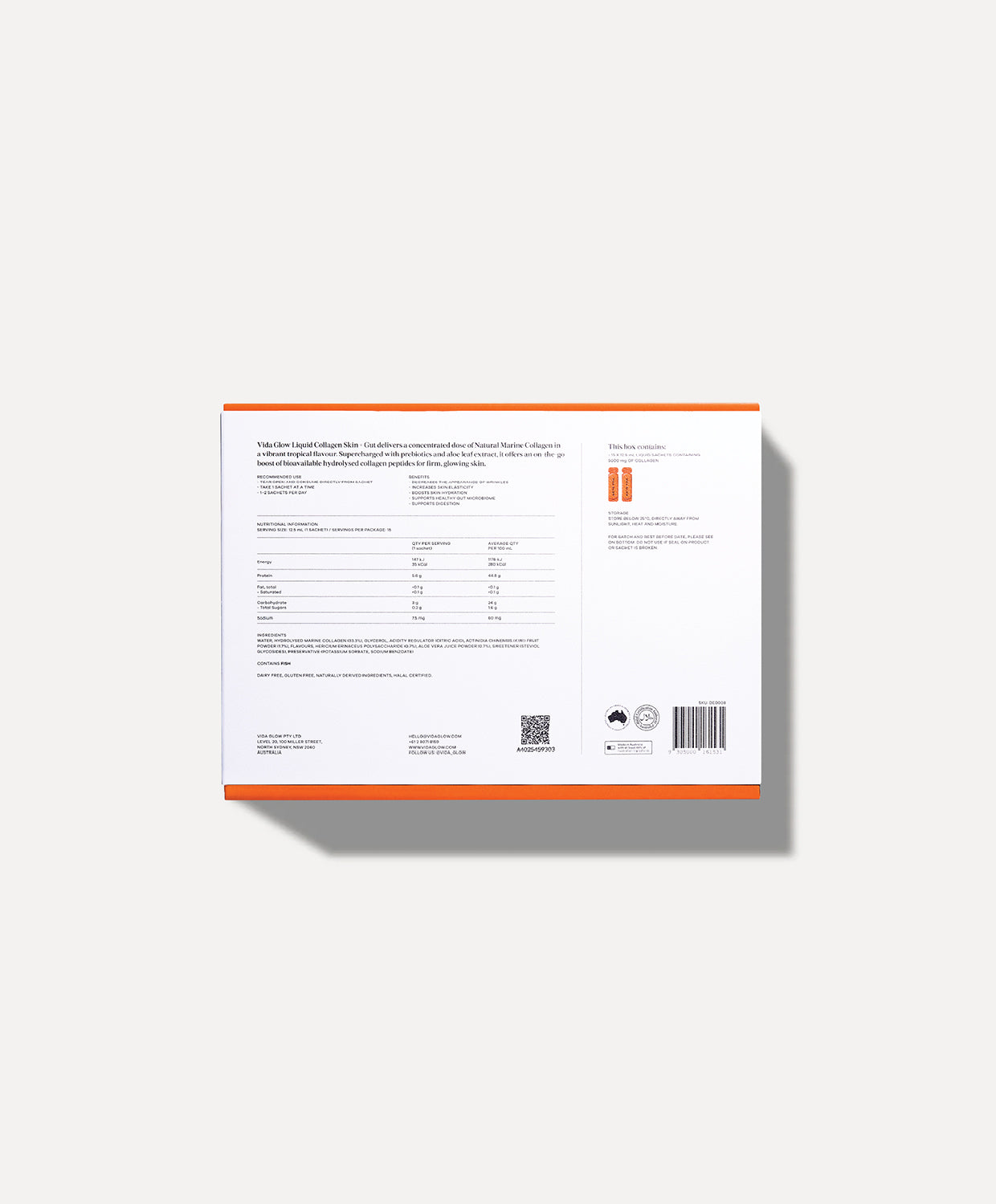 Liquid Collagen Skin + Gut is the ultimate addition to your beauty regimen, delivering a potent dose of marine collagen combined with a powerful antioxidant complex and gut-supporting ingredients to combat visible signs of skin aging and support your gut. Each sachet contains 5g of Vida Glow’s scientifically proven Natural Marine Collagen. Enhanced with aloe vera and prebiotics to help support gut microbiome balance and maintain digestive health.