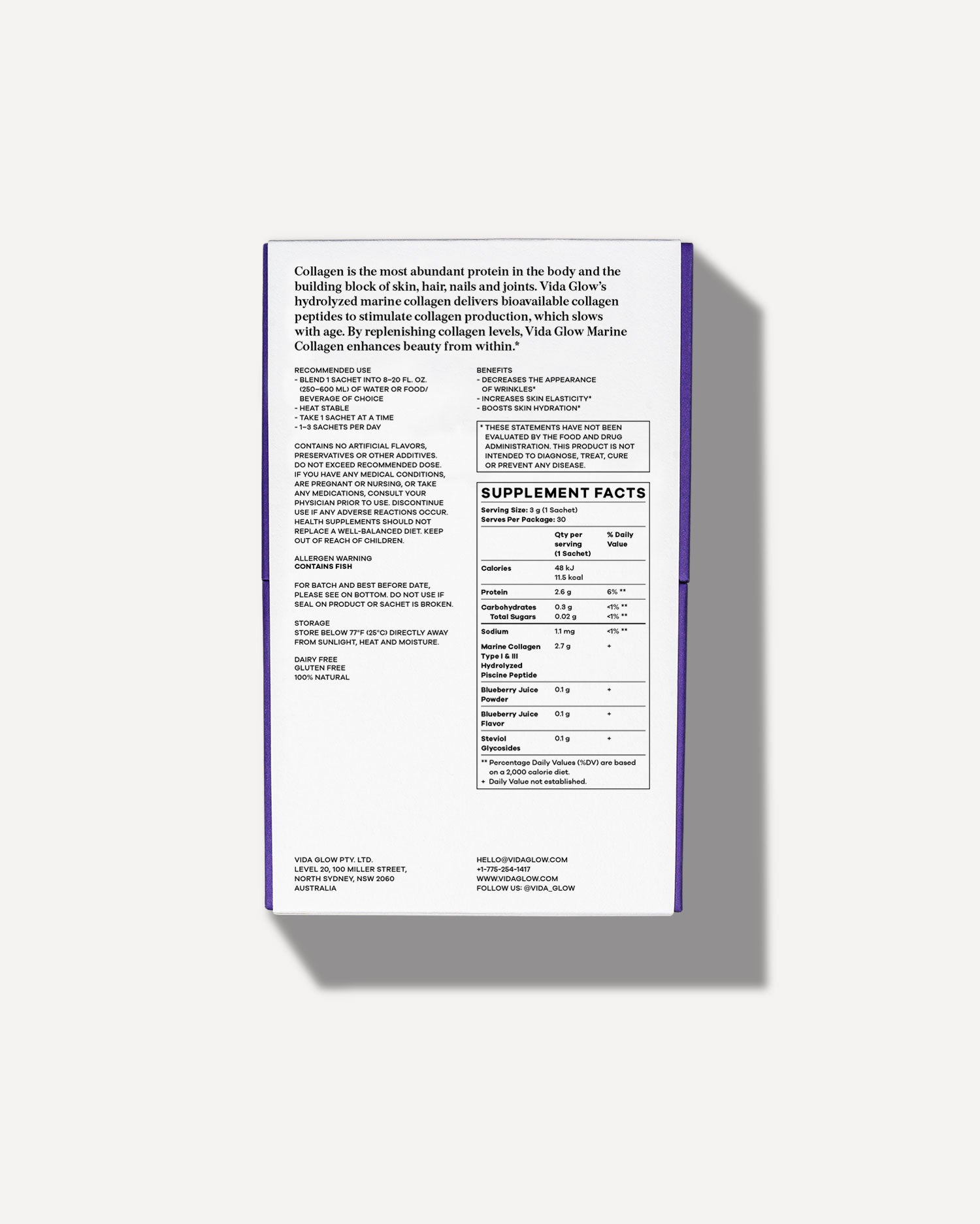 Experience the Vida Glow difference with our Blueberry Natural Marine Collagen – where science meets nature for unparalleled beauty results.