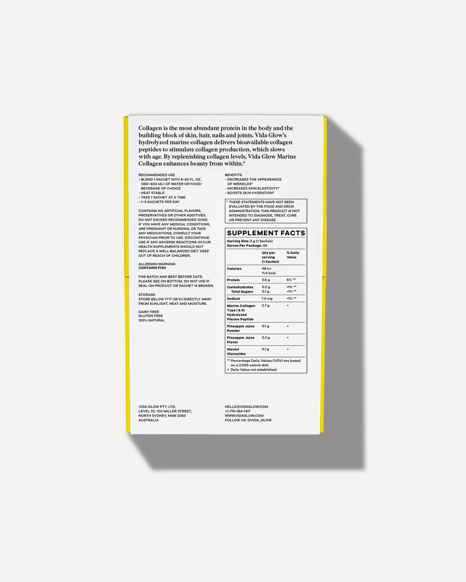 Our Pineapple Natural Marine Collagen is a premium collagen supplement derived from sustainably-sourced fish skin. Vida Glow's innovative hydrolysis process breaks collagen down into peptides for optimal absorption, allowing your body to efficiently utilize and stimulate fresh collagen production.