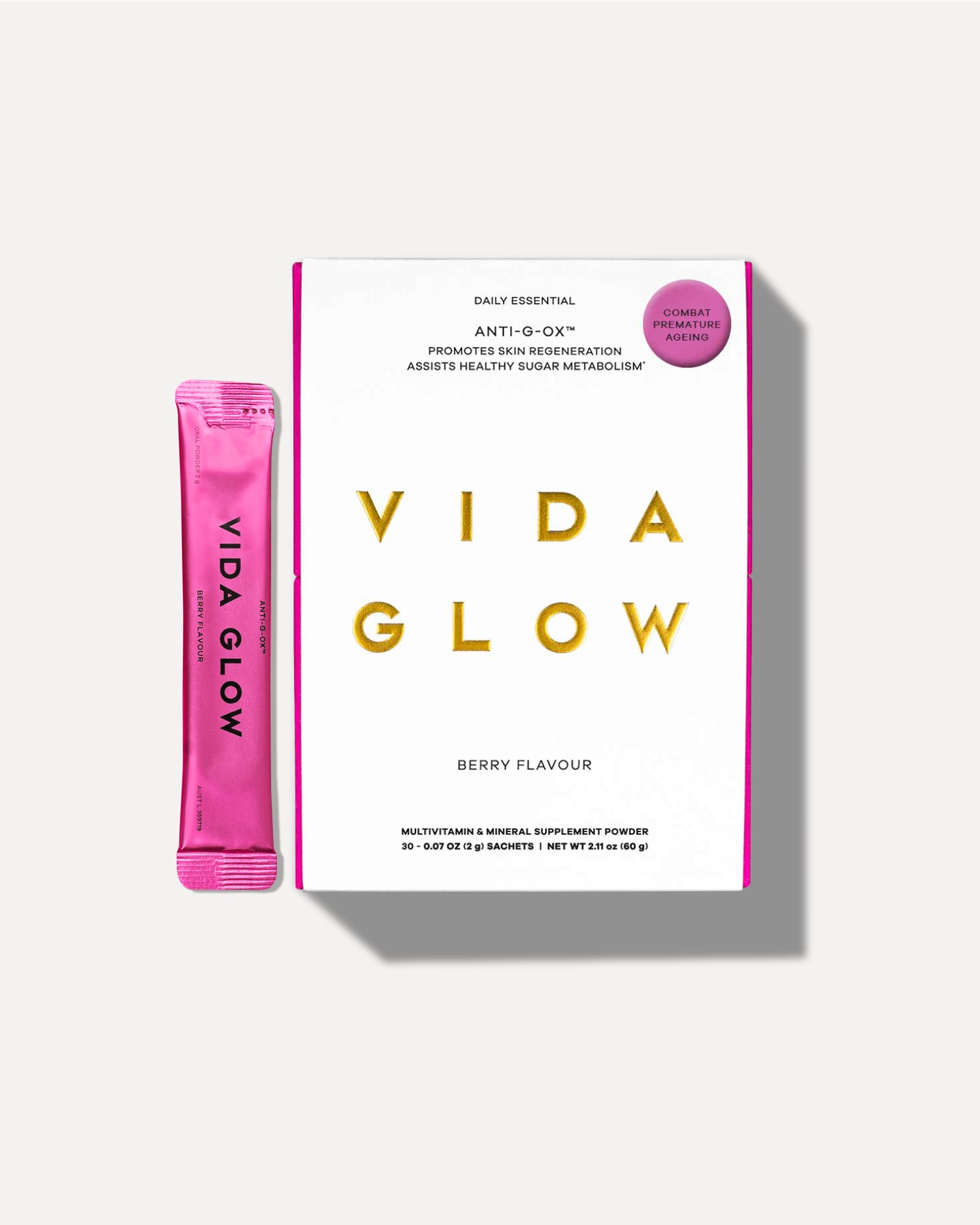 Anti-G-Ox Berry is a daily antioxidant supplement that defends against three root causes of premature ageing. Inflammation, advanced glycation end products (AGEs) and oxidative stress. A potent blend of actives work synergistically to enhance skin regeneration, assist healthy sugar metabolism and reduce free-radical damage caused by modern life.